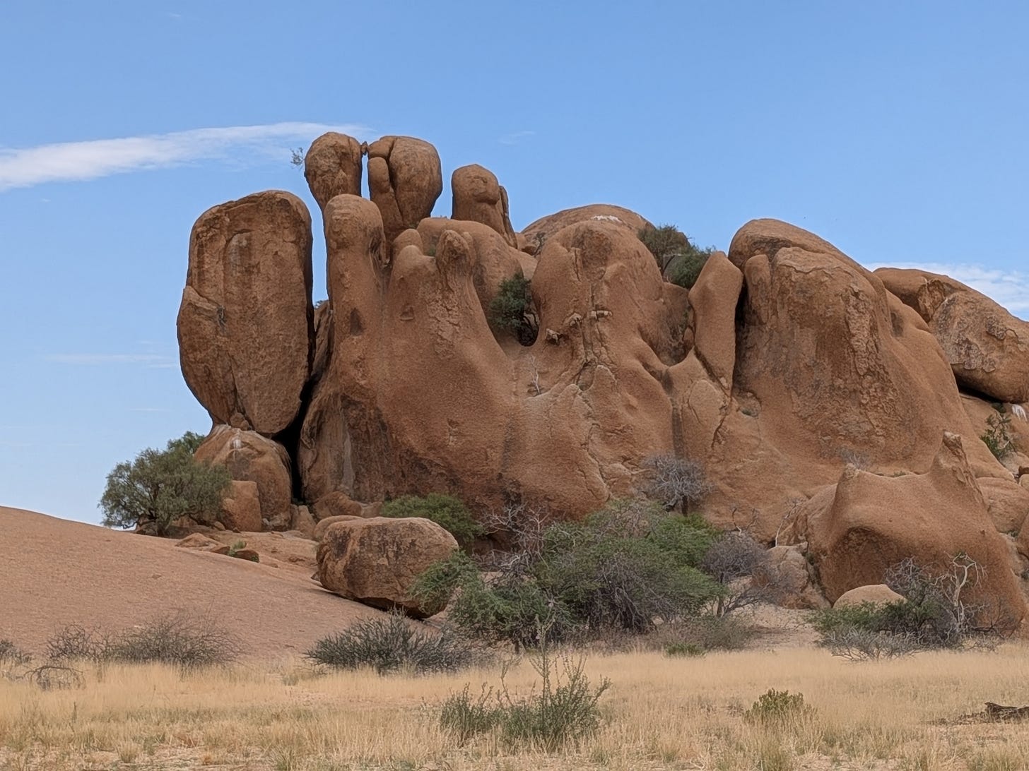 De la ocean am luat-o spre interiorul țării, spre un loc magic, ancestral. După un drum de aproximativ 2 ore am ajuns în Spitzkoppe, un loc de care m-am îndrăgostit pentru liniște, peisaje și apusuri. Spitzkoppe este un grup de vârfuri vechi de sute de milioane de ani, care răsar pur și simplu din nimic. Formele rotunjite ale stâncilor mi-au amintit de găluștele cu prune tăvălite prin zahăr brun. Zona este cunoscută atât pentru formațiunile stâncoase, cât și pentru picturile rupestre vechi de aproximativ 4.000 de ani.